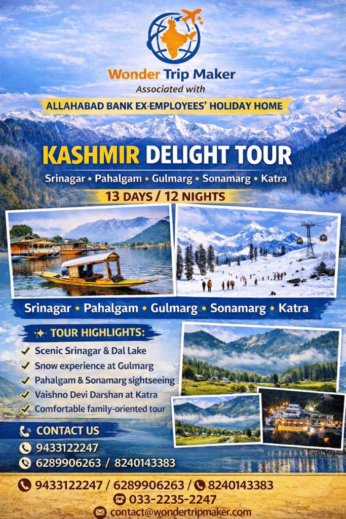 Experience the unmatched beauty of Kashmir with Wonder Trip Maker, proudly associated with Allahabad Bank Ex-Employees’ Holiday Home.